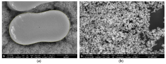 The main idea behind this idealized model is to calculate the amount of dispersant, in grams per square meter, by using the geometrical calculations for the total surface area of the powder. However, neither the powder nor the fibers have regular shapes, such as spherical or cylindrical and uniform distributions of particle size, as seen in Figure 4a,b. For these reasons, BET measurements are more reliable than geometrical calculations to provide the surface area of powder and fibers.