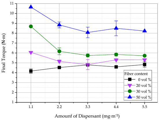 By adding fibers to feedstocks, there is a general increase in final torques that will be evaluated later. With the presence of fibers, the surface area definitions have become relatively more reliable, because not only do the fibers have significantly lower surface areas than powders but, also, they hold their shape even when they break down into smaller fibers. For example, if all fibers are chopped from 3200 µm into 50 µm, the increase in stearic acid should be less than 1 weight %, because the initial lateral area remains the same, and only the fractured surface areas should be considered. For these reasons, increasing stearic acid improves the flow behavior of the feedstocks with fibers as expected, and 3.3 mg·m−2 is the lowest point for fiber-filled variations.
