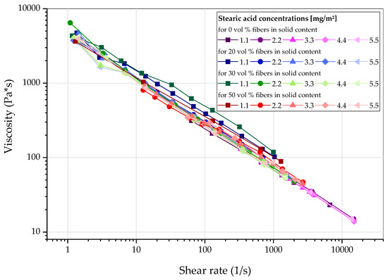 Separate representation of the viscosities of different feedstocks with increasing fiber content and stearic acid.