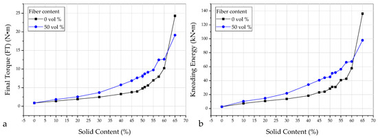 Once the stearic acid quantity has been defined as being constant, the effects of solid content on the final torque (FT) and kneading energy (KE) of different feedstocks were investigated and demonstrated in Figure 7a,b. The experiments included the paraffin wax-based feedstocks without fiber and with 50 vol % fiber content. It is clear that relatively higher torques are needed for the fiber-filled feedstocks to achieve the same rotational speed during kneading, as for the feedstocks without fibers (e.g., ca. 8.1 Nm with fibers vs. 4.8 Nm without fibers at 50 vol % solid content). This behavior changes at a point between 60 and 65 vol %, where the standard feedstock without fibers shows a gradually higher final torque and kneading energy. With increasing solid content in the feedstocks, the corresponding final torques and kneading energies increase with similar exponential growths, because the particle–particle interactions or, in highly fiber filled feedstocks, rather particle–fiber and fiber–fiber interactions, started to dominate the mixtures from a critical solid content instead of polymeric slip layers between particles and fibers, which means an increase in inner friction.