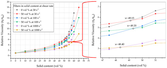 In Figure 8, the solid content dependency of relative viscosity at different shear rates is demonstrated. The figure on the right side represents the focus on a range between approx. 47.5 and 52.5 vol % of solid content, in which feedstocks with and without fibers reach the same viscosity. From that equilibrium point, the feedstocks with 50 vol % fibers in solid content show lower viscosities, and the difference between two variations increases with increasing solid content. Although the torque measurements are available for both feedstocks at 65 vol % solid content, the viscosity of 65 vol % for feedstock without fiber variation could not be measured, which means that the feedstock has reached the infinite viscosity and shows no flow anymore. Additionally, 65 vol % is relatively near to the theoretical maximum filling degree of about 70 vol % (see “Phi max.” for 0 vol % in Figure 9). On the other hand, the viscosity of highly fiber-filled feedstock at 65 vol % solid content could be measured, where the fibers that enable flowability even at higher solid contents [28] [30] most probably are oriented and flow together.