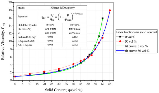 Application of Krieger and Dougherty model for defining the maximum possible solid content in the feedstocks with 0 and 50 vol % fibers in solid content.