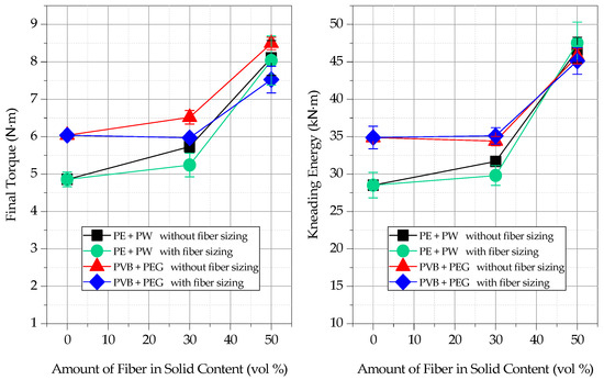 In general, paraffin wax (PW)-based feedstocks have a lower final torque (4.9 vs. 6.0 N·m) and kneading energy (28.5 vs. 34.9 kN·m) than the PEG-based feedstocks, until they are highly filled with fibers. The final torque and kneading energy values of PW-based feedstocks converge towards 50 vol % of fibers in solid content at 8 N·m and 47 kN·m, respectively, and the effect of PVA sizing is noteworthy only at 30 vol % fibers. Furthermore, the final torques of PEG-based feedstocks do not converge at a certain point, and the amount of PVA sizing increases together with an increasing fiber content, which causes a growing distance between values, in which the feedstocks with PVA have lower final torque values, e.g., 8.49 vs. 7.52 N·m at 50 vol % fibers in solid content. On the other hand, the effect of PVA sizing is not significant for kneading energies, yet the feedstock with PVA has, still, a lower kneading energy. The effect of PVA sizing can also be seen in the viscosity results (see Figure 11).