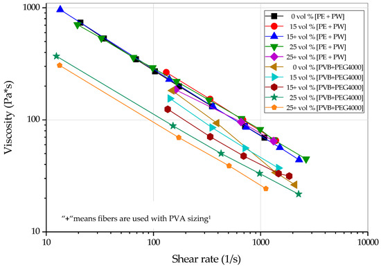 The differences in viscosity results are prominent between two binding systems. PW-based feedstocks show very similar viscosities, where PVA sizing leads to a slight decrease compared to 0 vol % fiber variations. On the other hand, the PEG-based systems have lower viscosities, as a whole, and the viscosities decrease with increasing fiber content from 182.7 (0 vol %) to 69.5 (50+ vol % (“+” means fibers are used with PVA sizing)) Pa·s at 100 s−1 apparent shear rate within the group. Additionally, the effect of PVA sizing is also apparent in both systems, in which the sizing leads to a decrease in viscosity at different ratios, as shown in Table 5. The PW-based systems show linearity in the viscosity measurements that caused the same percentage of decrease. On the other hand, PEG-based systems tend to change the slope with increasing shear rates, also with PVA sizing. Additionally, it must be considered that the amount of PVA increases with increasing fiber content.