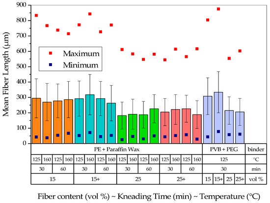 Figure 14 demonstrates the mean values of fiber lengths with standard deviation versus feedstock and process parameters, including fiber content, presence of fiber sizing, kneading temperature and time, and alternative binding system. The maximum and minimum fiber lengths were also added to the diagram for comparison. In general, the concept of kneading ruptured the fibers from 3200 µm to ~300 µm, which were also in the region of 50 to 500 µm, as given in the literature for injection molding of short fiber-reinforced polymers [8]. This led us to expect further breakage during injection molding down to 100 µm or lower. It is also noticeable, for both binding systems, that the increase in fiber amount lead to a decrease in fiber length, from ca. 300 to 200 µm. However, the fiber lengths are slightly higher in PEG-based systems. On the other hand, increased kneading temperature and time show almost no effect on the fiber length. For these reasons, the processing parameters were fixed at 125 °C and 30 min kneading temperature and time during feedstock production for injection molding experiments.