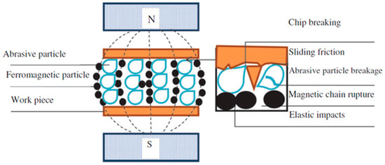 Surface finish is regarded as one of the key precursors of functional integrity of many high-end mechanical components. In this regard, as an alternative, magnetic abrasive finishing (MAF) recently emerged as an advanced surface technique to ensure superior finishing. MAF uses a flexible magnetic abrasive brush as a cutting tool to remove material via a combination of interrupted nanoscale/microscale indentations and shearing, with the aid of controlled magnetic force produced by permanent or electro magnets [1,2]. Figure 1 shows a schematic diagram outlining the material removal mechanism in MAF [3]. The overwhelming benefit and efficacy of MAF was extensively studied by researchers in the past [4,5,6].