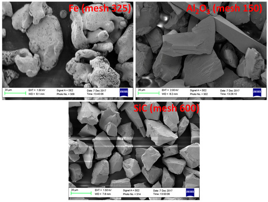 Representative SEM images of magnetic Fe, and abrasive Al2O3 and SiC particles.