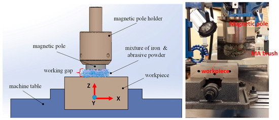 According to design of experiments (L27), a series of finishing tests were conducted on a flat workpiece surface. Figure 3 shows a schematic of the experimental set-up. The tests were performed on a three-axis milling machine (Metal-Master BM-52VE), in which the workpiece was attached on the table which could move along X- and Y-directions on a horizontal plane, and a cylindrical permanent magnetic pole attached with an in-house built tool holder was mounted onto the spindle head. The magnetic pole (composed of Nd, Fe, and B elements) was 25 mm in diameter, and had a magnetic flux density of 0.59 T with a pulling strength (force) of up to 260 N. Such magnetic strength was found to be sufficient to create adequate magnetic pressure at the interface between the workpiece and the abrasive brush to cut micro material from the surface. The appropriate amount of abrasive and magnetic powder mixture was attached on the bottom face of the magnetic pole, forming a flexible magnetic abrasive brush (FMAB). Each finishing pass was 80 mm of linear movement of the magnetic brush (approximately 25 mm in diameter) against the workpiece along the x-axis, resulting in a finished area of 80 mm × 25 mm. At each test condition, three finishing passes were continuously performed, resulting in a total linear distance of 240 mm traveled by the FMAB. Surface roughness was measured before and after finishing to compare the quality of surface finish improvement. Note that each test was repeated at least three times to ensure the reliability of measured data (i.e., surface roughness as a response variable) with an acceptable statistical significance.