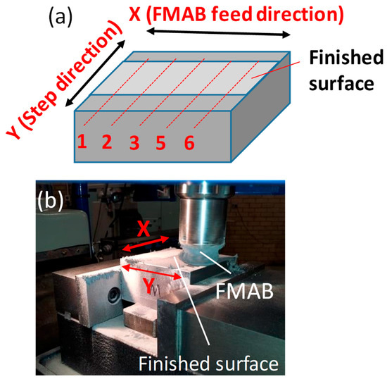 Surface roughness (Ra) was measured with a Mitutoyo’s Surftester (Model: SJ 211 by Mitutoyo, Japan), whereby measurements were taken along five different lines (y-axis) perpendicular to the FMAB feed direction (x-axis) on the finished surface, as shown in Figure 4, and their average was taken as the final value. The cut-off length used the during roughness test was 2.5 mm. Samples before MAF were prepared by face-milling with an initial roughness Ra ranging between 0.2 and 0.46 µm (mean Ra of 0.33 µm). For the sake of performance improvement comparison, the percentage of reduction in Ra due to MAF was considered as the final response output, ∆Ra, which can be defined as the difference between the initial roughness (before MAF) and the final roughness (after MAF), as expressed below.