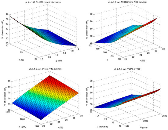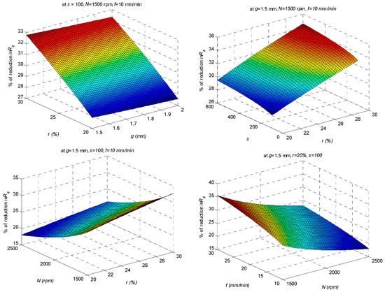 Using the models, the response surfaces illustrating the effect of the process parameters on surface roughness reduction were plotted. As a representative, Figure 7 and Figure 8 show the influence of the significant parameters for SiC and Al2O3, respectively. It is seen from Figure 7 that the reduction in surface roughness increased significantly with the increase in percentage of abrasive amount (r) and the decrease in spindle speed (N). Similarly, as the working gap (g) and the mesh number (s) increased, the reduction in surface roughness increased as shown in Figure 8. The response surface plots showing the effect of parameters estimated by the models are quite consistent with the S/N and ANOVA analysis.
