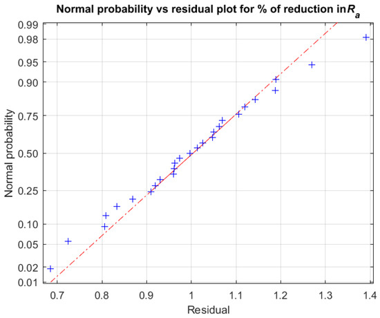 A residual analysis was performed to verify the correlation between experimental and predicted responses for MAF with SiC and Al2O3 abrasives. The residual can be defined as the difference between the experimental and predicted values for each point in the L27 experimental plan considered in this study. The residual analysis shows a good correlation for modeling of surface roughness reduction, in which the quality of fit R2 = 42.46% for SiC and R2 = 91% for Al2O3 abrasives. In addition, the normal probability plots of the residuals between experimental and predicted values for ∆Ra (%) are depicted in Figure 9 and Figure 10. It can be seen from both figures that the residuals closely match with the straight lines, indicating a normal distribution. Furthermore, an independent finishing test was conducted to confirm the accuracy of the models for MAFed with SiC and Ai2O3. Test trial parameters were chosen as g = 1.65 mm, r = 27%, N = 1800 rpm, and f = 15 mm/min, with s = 400 for SiC and 360 for Al2O3, whereas the percentage of roughness reduction was predicted by the model and was obtained from the experiments compared in Table 7. It is seen that the models for SiC and AI2O3 were able to predict ∆Ra accurately, with an error of 23.32% for SiC and 9.5% for Al2O3. The large error for SiC model would be due to a very complex interplay in the mechanism involving wear of particles and heat generation, which may affect micro material removal in MAF. Dynamics of interactions between type and geometric shape of abrasive with magnetic particles resulting in micro-cutting forces responsible for material removal are worth noting, which could be a potential inviting topic of further research to shed light on this. It may be concluded that the developed models in this study are reasonably accurate and reliable, and they can be employed for the estimation of surface roughness reduction in magnetic abrasive finishing of mild steel surfaces.