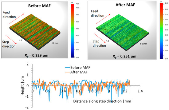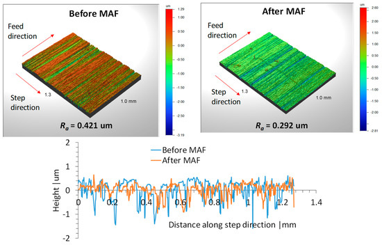 Three-dimensional topography and surface roughness profile before and after MAF at g = 1.5 mm, r = 20%, s = 150, N = 1500 rpm, and f = 10 mm/min with Al2O3 abrasive particles.