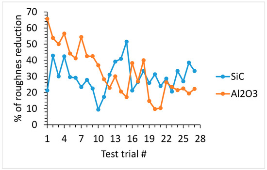 Comparison of percentage of roughness reduction between SiC and Al2O3 abrasives with respect to test trials.