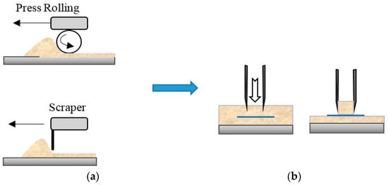 (a) Illustration of layer formation by two examined spreading tools. (b) Process of using a plug to sample the powder bed to measure spread density.