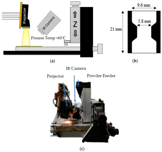 (a) Diagram of the set up used to simulate the large area projection sintering (LAPS) additive manufacturing process. (b) The image projected onto the powder mixture to fabricate each sample. (c) A photograph of the hardware.