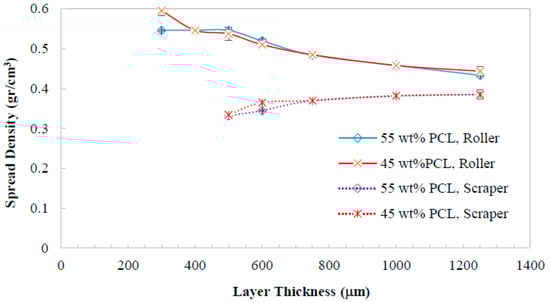 The results of the material layering experiments (Figure 4) indicated that, regardless of the demineralized bone fraction in composites, the packing level of the layers were correlated to the spreading tool and the layer thickness. The results demonstrated that the roller spreads denser layers than scraper methodology. It was also able to create thinner layers (300 µm) when compared against the scraper (500 µm) as the lower bound of layer formation. These differences can be attributed to the contact dynamic of the spreader tools with the material [].