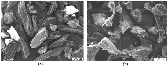 The SEM image of the powders sieved down to <300 µm. (a) Demineralized bone particulates and (b) polycaprolactone (PCL) powders. Scale bars represent 300 µm.