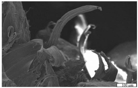 It is evident that the PCL content plays a key role in the mechanical strength in both the LAPS and mold method based on the significant difference in the strength for 45% and 55% DBM fractions. Over the range of compositions studied, there is a nonlinear increase in strength with PCL concentration. This may be due to reaching a critical concentration at which the PCL is able to form a bonded structure. This is analogous to observations of particle loading required for achieving electrical conductivity []. A micro-image of the fracture surface (Figure 7) indicated a significant deformation in PCL fibers due to the tensile testing before failure.