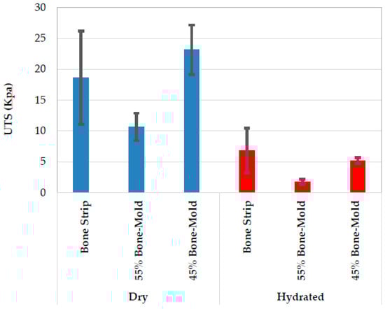 Additional sets of the molded DBM/PCL mixtures and the machined demineralized bone samples were prepared by the same process to evaluate the ultimate tensile strength (UTS) change in the hydrated state to mimic the body environment. Therefore the dry samples were immersed for 30 min in a solution of 8% NaCl by weight in deionized water []. The tensile strength was measured immediately after removal. In addition to the hybrid samples, pure PCL samples were prepared using the molds and then tested to determine the upper bound of the mechanical strength.