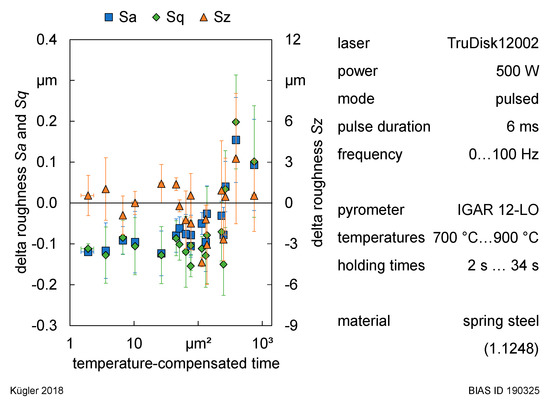 For the spring steel investigated in this study (1.1248), low irradiations, characterized by a low temperature‑compensated time, led to a smoother surface in terms of lower Sa and Sq values (see Figure 5). Higher roughness values can only be identified for intense irradiations with temperature‑compensated times over 250 µm2. The maximum heights (Sz) of the laser‑heated surfaces are almost identical to the initial state.