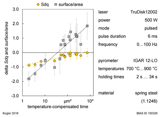 Both the changes in the hybrid roughness value Sdq and in the topography factor surface/area are increased with increasing temperature‑compensated times (see Figure 6). However, it is noticeable that a reduction of these values can be observed for low temperature‑compensated times. Changes in the topography factor surface/area are positive for temperature‑compensated times over 50 µm2. Sdq values are closer to the initial state the more intense is the heating.