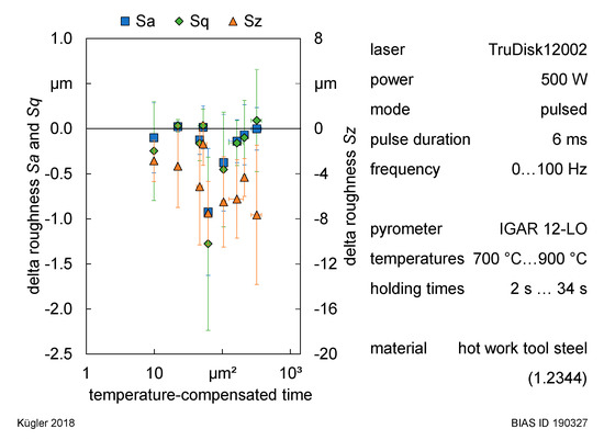 The roughness changes of the hot work tool steel (1.2344) induced by laser beam heating are shown in Figure 7. The mean values Sa and Sq are not significantly changed by laser irradiation, although there is an outlier with a decrease of the roughness and simultaneously high standard deviation at a temperature‑compensated time of 61.84 µm2. However, changes in the maximum height (Sz) of irradiated surfaces show a tendency to decrease with increasing temperature‑compensated times.