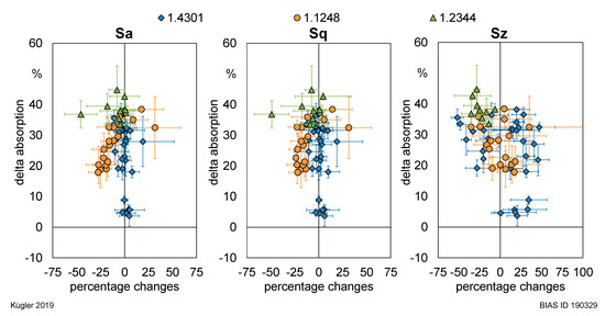 Investigations of the roughness prior to and after the laser heating indicate that absorptivity changes are not attributed to roughness changes induced by the short-term heating process (see Figure 9). The surface roughness values, like the conventional values (see Reference [3]), are not considered to be suitable to describe or predict the absorption of a metal surface, at least for the investigated steels. Instead of these roughness values, Bergström proposed considering the mean slope of a surface profile for the description of absorptivity [5]. However, the hybrid roughness value Sdq, which is the root mean square gradient and therefore close to the proposal of Bergström, seems not to be suitable for absorptivity predictions, at least for the stainless steel (1.4301) and the tool steel (1.2344). For the spring steel (1.1248), there is a certain dependency. However, on the one hand, intensive irradiations causing high absorptivity changes result in negligible changes in the Sdq value (see Figure 10). On the other hand, low irradiation results in a reduction of the Sdq value. Therefore, further additional indicators are required to predict the absorptivity changes of the spring steel (1.1248) with this hybrid roughness factor.