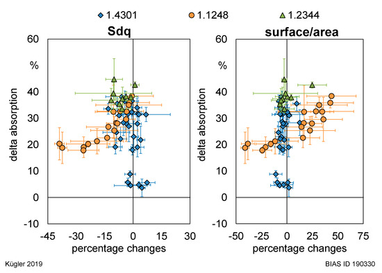 Influences of changes in the hybrid roughness value Sdq and the topography factor surface/area on the absorptivity are shown in Figure 10. For the stainless steel (1.4301) and the tool steel (1.2344), both increasing and decreasing values for Sdq and surface/area result in increased absorptivity. A tendency cannot be observed.