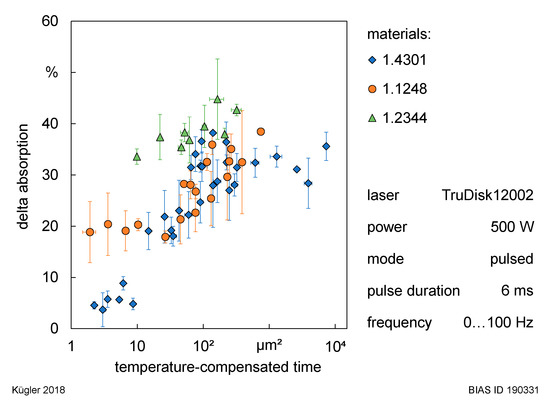 Changes in the absorptivity of the tool steel (1.2344) due to short-term heating are generally much more reactive. The described saturation level is already reached for lower temperature‑compensated times of 9.88 µm2. Further heating slightly further increases the absorptivity.