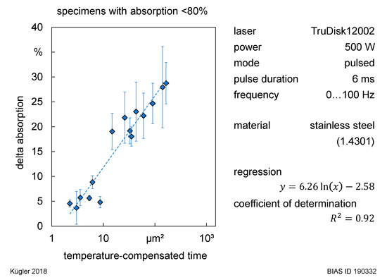In order to describe the increasing absorptivity of the stainless steel (1.4301) by increasing temperature‑compensated times, only short-term heating durations leading to increasing absorptivity up to a total absorption value of 80% are illustrated in Figure 13. It can be determined that the increasing absorptivity can be approximated by a logarithmic function.