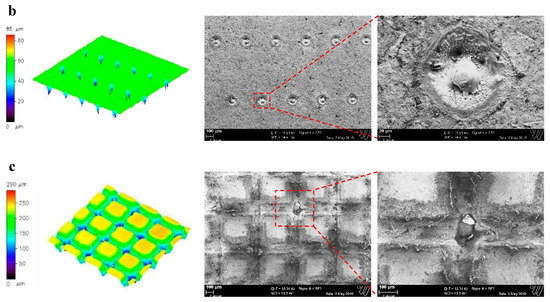 Figure 8a,c). A plausible reason for this reduction is a large increase in the surface area due to the grid compared to that with holes or with grooves on the surface. Additionally, in