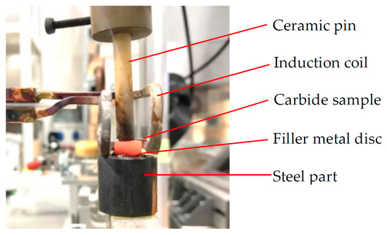 The heating source was an induction coil operating at a frequency of 30 kHz and 2 kW power. The power source of the induction heater was controlled with the thermometer output using a LabVIEW program. The working temperature was set at 720 °C and holding time at 5 s. BrazeTec special-h compound was used as the flux in the form of paste on both sides of the filler metal disc before brazing. The temperature was measured using an Optris infrared thermometer CT-laser 3M having a measurable range from 50 °C to 1800 °C with a spectral range of 2–3 µm. The laser of the thermometer was pointed at the carbide part slightly above the filler interface to avoid pointing the laser at bubbles formed due to flux.