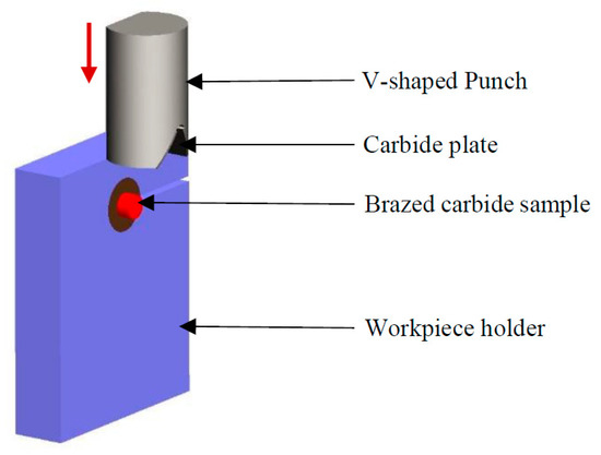 Figure 5. The v-shaped punch had 2 mm thick tungsten carbide plates glued on to it for wear resistance. The brazed samples were sand blasted at the edges of the brazed joint to provide a flat contact surface for the punch so that a pure shear loading at the brazed joint may be achieved. The punch moved downwards at a constant speed of 1 mm/minute. No pre-load force was used. The brazed samples, which had grooves on the surface, were loaded in the direction perpendicular to the direction of the grooves and those with grid structure at 45°. The loading direction was chosen in accordance with the results given in [