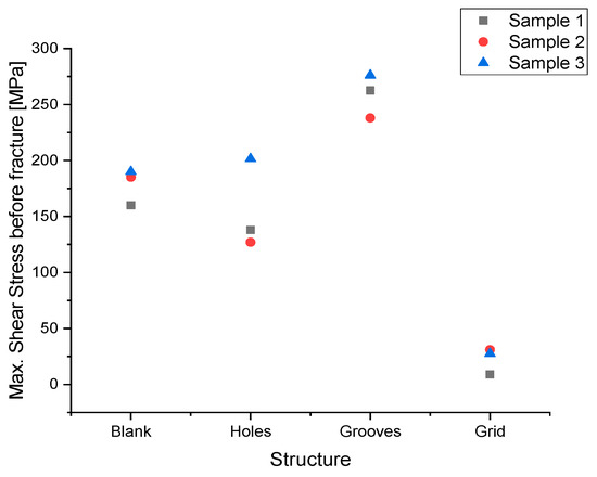Figure 6. The maximum shear strengths of about 250 MPa were obtained for the samples having grooves in the direction perpendicular to the applied force. Holes or dimples on the surface have shown little to no effect on the strength of the brazed joints compared to the blank surface, whereas the grid structure has resulted in very low joint strengths of on average 25 MPa. For blank, holes and grooves the fracture was partly at the carbide/filler interface and part within carbide. For the grid, all three samples fractured completely at the carbide/filler metal interface.