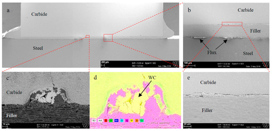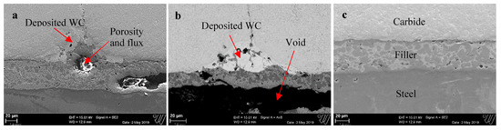 Figure 8c shows the interface between filler and carbide. In addition, the filler layer itself contains small porosities shown as black colored spots again indicating the lack of channels for gases to flow out of the melt zone. In contrast to