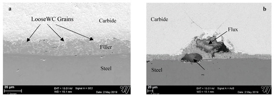 Figure 9a, the filler/carbide interface shows granular WC particles dispersed in the filler layer. They reduce the extent of the metallurgical bonds between the filler metal and the binder of the cemented carbide. These particles most likely result from deposition of the ablated WC particles on the carbide surface once the laser is moved away. The laser likely breaks the bond between WC particles and the Cobalt binder such that the individual granulates are very weakly bound to the carbide surface. However, these could not be removed by sand blasting and ultrasonic bath cleaning. During brazing, the higher temperature caused the bonds to weaken and thus individual WC grains dispersed to an extent in the filler layer. This is particularly critical for the grid surface pattern as the laser is moved twice the number of times across the surface as in case of grooves. This finding corroborates the rough SEM images of the grid surface seen in