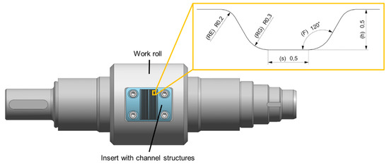 All specimen were cut from a coil with a stationary mechanical precision shear to the size of 52 mm × 28 mm. The rolling experiments were performed on a Duo/Quarto EW 105 × 100 strip rolling mill (Bühler und Co GmbH, Pforzheim, Germany). For the use of roll forming bipolar plate channels, adjustments had to be made on the working rolls. Within a turning and milling centre (NILES N20 MC2000, Chemnitz, Germany), pockets had to be machined in both of the roller tools, for the inserts with the geometrical structures of the bipolar plate channels (Figure 1).