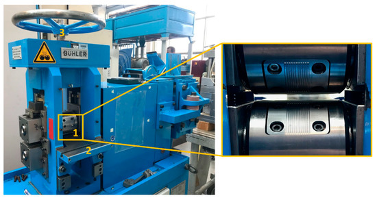 Experimental setup of the roll forming process. (1) rolling gap; (2) roll table; (3) adjustment wheel.