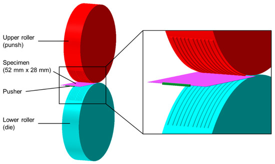 All geometries constructed for the machining of the work rolls and inserts were simplified and transferred into the numerical simulation via the STEP exchange format (Figure 4). Additionally, a pusher was designed to overcome the roller feed in the FEM model.
