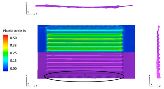 FEM results (geometry (purple) and plastic strain) of the roll forming process. (1) wrinkles.