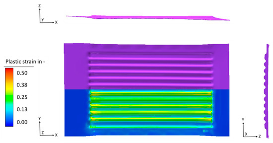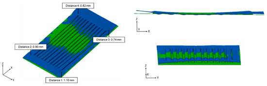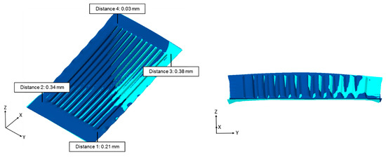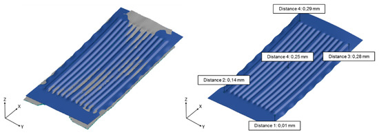 An additional measurement was done by means of the photogrammetry method (GOM ATOS Core, Braunschweig, Germany). This enables a direct comparison between the calculated numerical forming result (blue) and the experimental specimen (grey). Figure 10 shows a very good conformity for the geometrical shape, with a maximum deviation in the distance between both results of 0.29 mm.