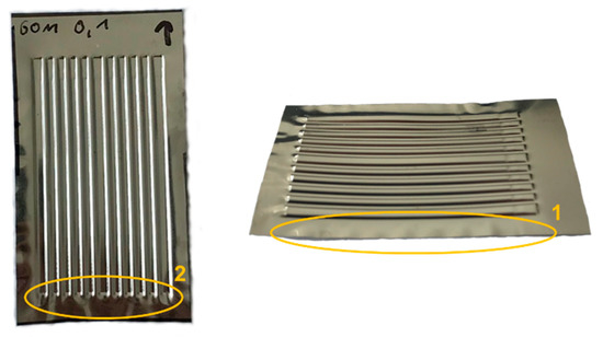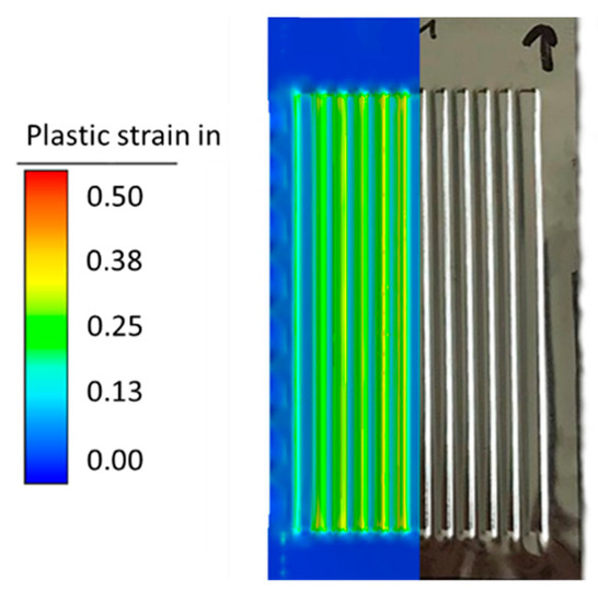 In accordance to the geometries and parameters described above, the experimental tests were performed. The experiments showed equivalent results to the numerical simulations, which leads to the fact that the prediction of the numerical simulations worked very well. The channel geometries were successfully formed in the 0.1 mm metal foils by rolling, while the other geometrical characteristics, which can be seen in the numerical results (Figure 5), occurred in the experiments too (Figure 7).