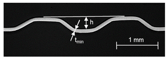 Additionally it can be seen, that the formed structure of this setup developed without any significant thinning in the radii and flank areas and a minimum thickness (tmin) of 84.8 µm in one of the measured bottom radii (Figure 8). This means, that the roll forming process with the used parameters is in a very safe area regarding possible damage effects like cracks. Additionally, it has to be said, that a reduced rolling gap (< 0.12 mm) can lead to more extensive thinning.