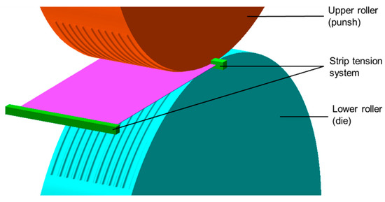 Within deep drawing processes of metal foils, a binder can be used to enhance the quality of the products. For the roll forming process, this is not feasible. For this reason, a strip tension system was implemented numerically, to reduce the effects of wrinkling and bending within the roll forming process (Figure 12).