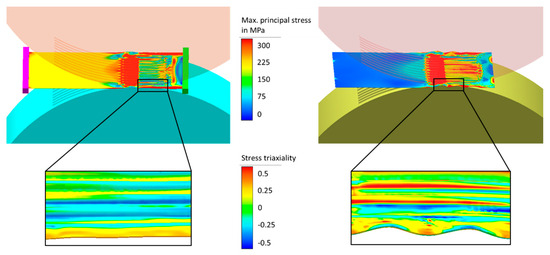 Maximum principal stress during roll forming, (left) with strip tension, (right) without strip tension with enlargements of stress triaxiality.