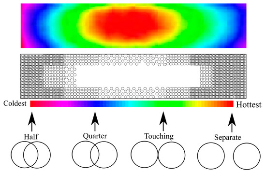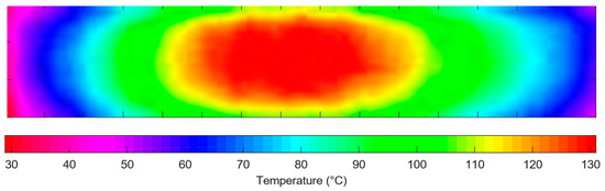 Figure 10 shows a thermal image of the heating element without any treatment. The hottest area is the central region, with the coldest areas on the edges. The aim of the control strategy is to increase the uniformity of the temperature profile. Since there is a continuous change in temperature across the element, the material removal must continuously vary so that the amount of damage to the film is minimized, ensuring no abrupt changes in surface topography, which may cause early failure and non-convergence of the ablation process. This is achieved by continuously varying the distance between the pulses as a function of local temperature. Figure 10 shows how the density of pulses can be changed depending on the temperature of the element. The coolest areas are ablated with a high density of laser pulses, whereas the hotter areas are ablated less.