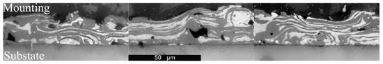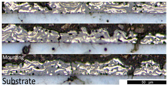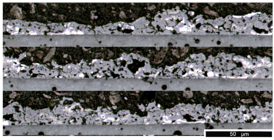 To further investigate how deeply the laser penetrates the film and the effect of the pulse of the laser on the material, unablated and ablated films were cross-sectioned and polished. A trial is shown in Figure 5 and Figure 6, wherein the unablated film is shown at several locations in Figure 5, and the same film ablated at 30 W with a scanning speed of 300 mm/s corresponding to an applied fluence of 0.5 J·mm−2 is shown in Figure 6. The laser lines are perpendicular to the image cross-section.