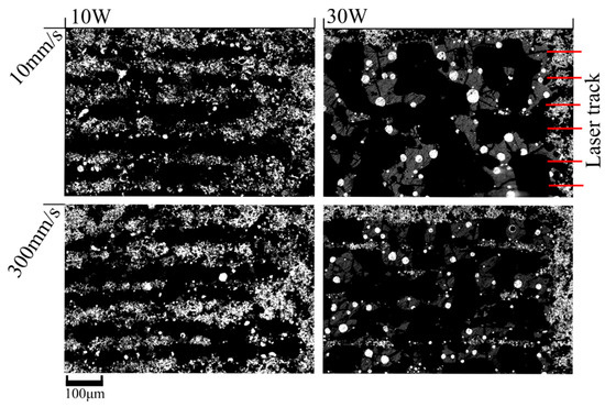 Initial tests took place to calibrate the laser settings to achieve the optimal combination of the speed and laser power to use on the material. A range of scanning speeds (10 mm/s to 300 mm/s) and laser powers (10 W to 30 W) were used to ablate the film; the effects of the four extremes of the laser’s settings are shown in a matrix in Figure 4. The laser in these tests was set to a continuous operation with the resultant fluence calculations taking account of this fact. The upper layer of the film has been ground to remove some of the oxide layer on top so that the difference in the composition of the dross and the size and morphology of the laser lines can be examined.