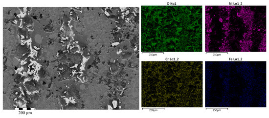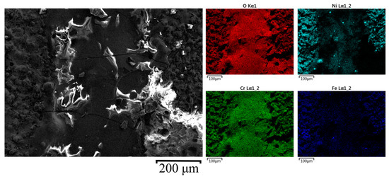 Within Figure 9, the laser channel has been visualized at a higher resolution to view the changes in the film composition within the heat-affected zone; this laser line has not been ground so the dross and raw film surface was observed. Within the heat-affected zone, the nickel content has decreased and the oxidation in the heat-affected zone and laser line has increased. This confirms what has already been observed with the optical imagery and the other SEM-EDX images.