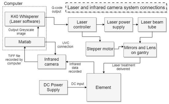 The system used to ablate the metal oxide films is a pulsed carbon dioxide laser with wavelength 10.6 m, maximum optical output of 40 W, minimum focus radius of 0.13 mm, laser head speed up to 300 mm/s and minimum pulse time of 33 ms. The infrared imaging sensor used was a Flir lepton 3.5 with a pixel array of 160 × 120, a thermal range of −10 to 400 °C with thermal resolution <50 mK. The field of view of the camera is 180 × 130 mm with a working distance of 200 mm at a 0.1 s exposure time. The components of the laser system and their connections to the other components are shown in Figure 11. A software diagram is shown in Figure 12. This diagram shows how the infrared data is taken by the Matlab script and turned into a processing strategy for the laser and how that laser outputs a specific strategy onto the element in each treatment cycle.
